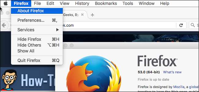 Mac-en a folyamat kicsit más. Csak kattintson a menüsor „Firefox” elemére, majd az „About Firefox” elemre.