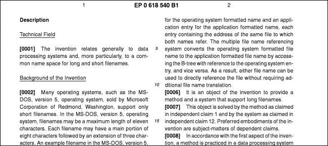 Bár itt nem ismerjük az összes szóban forgó szabadalmat, néhányat különösen ismerünk. A kérdéses szabadalmat gyakran „FAT szabadalomnak” nevezik. Dióhéjban: a Microsoft File Allocation Table (FAT) fájlrendszere, amely az MS-DOS-ig nyúlik vissza, támogatja a hosszú és a rövid fájlneveket. Vannak hosszabb nevek, mint a „MyDocument.doc” és a régi nyolc karakterből álló DOS fájlnevek, például a „MYDOC ~ 1.DOC”. A Microsoft szabadalma egy „ a rövid fájlnevek közös névtere . ” A FAT támogatás megvalósításához - így olvashatják például a FAT32 formátumban támogatott szabványos SD kártyákat - az eszközöknek támogatniuk kell azt a FAT fájlrendszert és ezt a megvalósítási részletet. A szabadalom európai verziója nemrégiben volt német bíróság érvénytelennek ítélte .