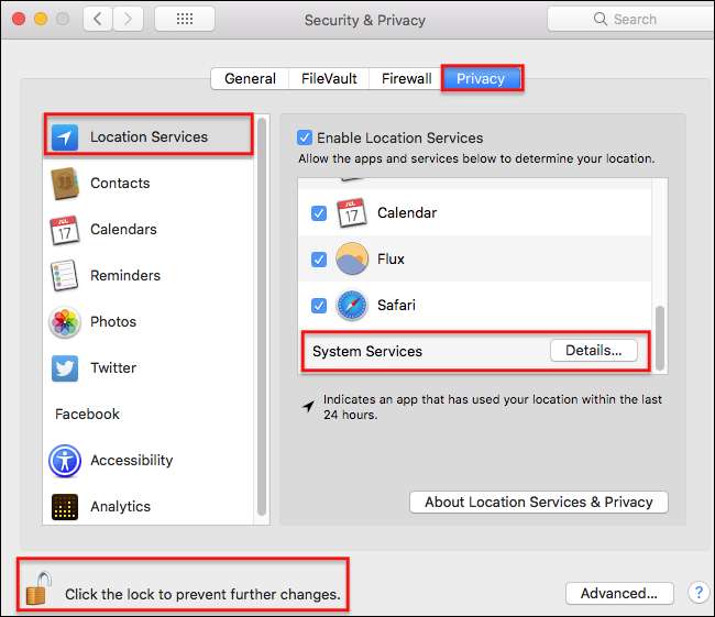 Menjen az „Adatvédelem” fülre. Kattintson a bal alsó sarokban lévő zárra, majd írja be a jelszavát. Győződjön meg arról, hogy a „Helyszolgáltatások” opció van kiválasztva a bal panelen, majd görgesse lefelé a jobb oldali panelt, amíg meg nem jelenik a „Rendszerszolgáltatások” felirat. Kattintson a „Részletek” gombra.