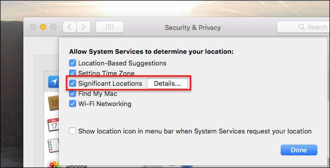 Itt láthatja az operációs rendszer azon funkcióinak listáját, amelyek felhasználhatják a tartózkodási helyét, beleértve az új Jelentős helyek funkciót. A jelölőnégyzet törlésével kikapcsolhatja a funkciót, de a jelenleg tárolt helyek megtekintéséhez kattintson a „Részletek” gombra. Mint mondtuk: ez kissé eltemetve.