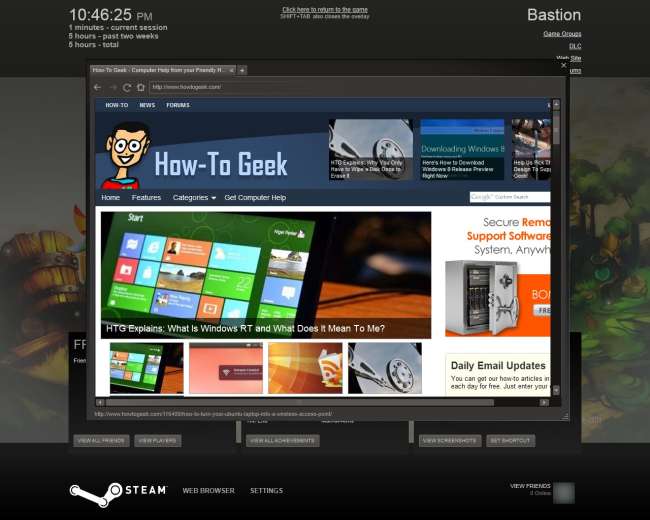 Tekan Shift + Tab saat memainkan game Steam untuk menampilkan hamparan Steam. Dari hamparan, Anda dapat mengobrol dengan teman Steam Anda, dengan mudah mengambil, melihat, dan mengunggah tangkapan layar - atau bahkan memuat peramban web tanpa Alt-Tab keluar dari gim Anda. Ini bisa jadi nyaman jika Anda mencari panduan untuk game yang Anda mainkan, atau hanya menjelajahi web selama waktu henti di game multipemain.