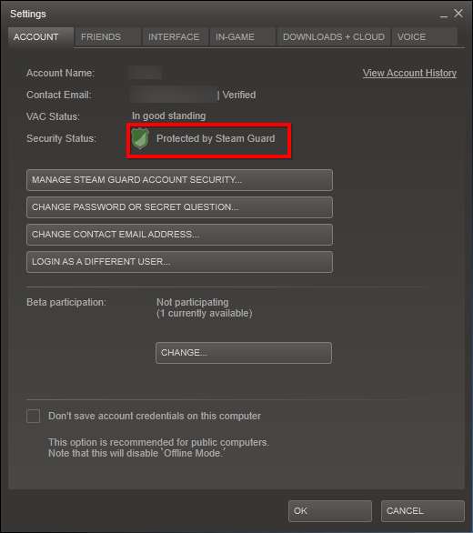 Untuk memverifikasi itu diaktifkan, klik menu Steam, pilih Pengaturan, dan cari bidang Status Keamanan di tab Akun.