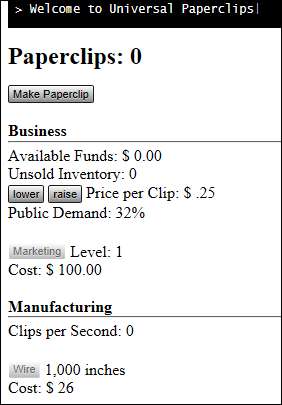 Ini adalah tarif permainan clicker yang cukup standar di awal: salah satu peningkatan pertama Anda adalah "autoclipper" yang mengklik tombol utama untuk Anda. Beli lebih banyak autoclippers untuk membuat lebih banyak penjepit kertas per detik. Sesuaikan harga agar sesuai dengan permintaan, memaksimalkan keuntungan Anda. Kemudian Anda dapat membuat gadget yang secara otomatis membeli gulungan kabel, dan dari sana, Anda kurang lebih bebas dari elemen “clicker” dari game tersebut. Sekarang semuanya tentang memaksimalkan produksi dan penjualan: semakin banyak autoclipper dengan efisiensi yang semakin besar, penggunaan kabel yang lebih efisien untuk meminimalkan biaya, peningkatan versi pemasaran untuk meningkatkan permintaan.