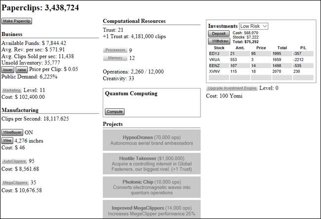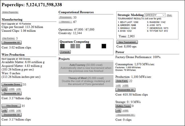 "Megaclippers" meningkatkan produksi Anda hingga seribu persen, lalu seribu lagi saat lebih banyak peningkatan diterapkan. Anda membuat puluhan ribu penjepit kertas setiap detik, terus meningkatkan kapasitas produksi dan komputasi Anda, menginvestasikan dana yang tidak terpakai ke pasar saham, dan memasang taruhan pada komputasi strategis untuk meningkatkan algoritme perdagangan Anda. Anda menggunakan komputasi kuantum bertenaga surya untuk meningkatkan kekuatan pemrosesan Anda dengan clicker-in-a-clicker yang hampir ironis.