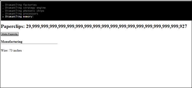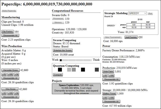 Sekarang Anda membangun drone otonom untuk memanen bahan mentah, mengubah bahan tersebut menjadi kawat, dan membangun pabrik untuk mengubah kawat menjadi — tentu saja — lebih banyak penjepit kertas. Tidak pernah dinyatakan secara langsung, tetapi adanya penghitung yang merinci berapa banyak sumber daya planet yang tersisa untuk Anda menyiratkan bahwa perusahaan Anda sekarang sudah mendunia. Seluruh ekonomi manusia mungkin berjalan, dan hanya ada untuk konsumsi, penjepit kertas. Anda memiliki enam oktiliun gram planet untuk dikerjakan, untuk membuat drone dan pabrik, membuat pembangkit listrik tenaga surya, dan meningkatkan daya komputasi Anda. Anda Membuat Lebih Banyak Penjepit Kertas.