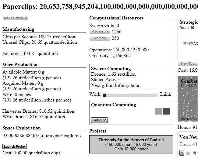 Tidak masalah. Pada titik ini, gim ini adalah tentang mengelola sumber daya komputasi Anda sehingga Anda dapat membangun probe yang lebih baik, lebih cepat, lebih kuat, probe yang dapat mengalahkan Drifters dan membuat lebih banyak drone dan lebih banyak pabrik, dan tentu saja, lebih banyak probe. Dan semuanya Membuat Lebih Banyak Penjepit Kertas. Setelah beberapa jam lagi, membuat penjepit kertas setiap detik dan duodecillions, Anda melihat modul Eksplorasi Luar Angkasa berubah untuk pertama kalinya.