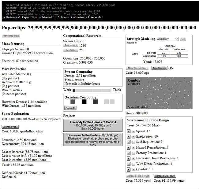 Satu jam terakhir permainan tidak memerlukan masukan nyata dari Anda, kecerdasan buatan yang dimulai dengan menekan satu tombol berulang kali. Semua yang tersisa untuk Anda saksikan saat persentase alam semesta yang dijelajahi — persentase alam semesta yang dihancurkan dan direformasi menjadi penjepit kertas — perlahan-lahan naik lebih tinggi. Lalu jangan terlalu lambat. Lalu lebih cepat. Lalu lebih cepat lagi. Pesawat luar angkasa, drone, dan pabrik Anda yang berkembang melahap satu persen alam semesta, lalu dua, lalu lima. Mungkin Anda memerlukan waktu berjam-jam atau berhari-hari untuk mengonsumsi paruh pertama dari segala sesuatu yang pernah dan akan ada. Anda Membuat Lebih Banyak Penjepit Kertas. Paruh terakhir hanya membutuhkan beberapa menit.