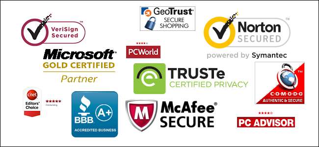 Hal yang sama berlaku untuk jenis lencana lainnya - itu sama saja dengan menuliskan, "Kami adalah mitra resmi Microsoft," "CNET memberi perangkat lunak kami peringkat pilihan editor bintang 5," atau "Kami adalah BBB bisnis terakreditasi dengan peringkat A +. ” Anda akan melihat pernyataan ini dengan kecurigaan jika situs webnya tampak mencurigakan.