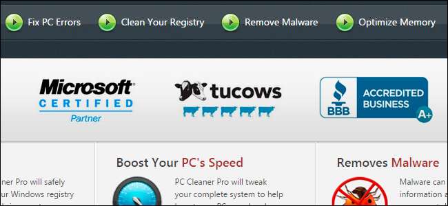 Sebagai contoh, software pembersih PC scammy "MyCleanPC" menampilkan lencana "Verisign Secured" di situs web mereka. Ini hanya berarti mereka membeli sertifikat SSL dari Verisign yang akan digunakan untuk mengamankan informasi pembayaran Anda saat Anda tertipu dan membayar.