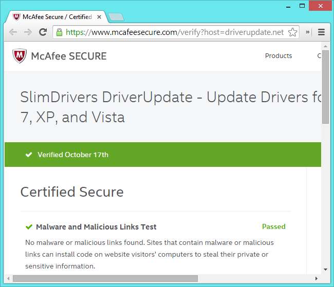 Alat pemutakhiran driver yang tidak berguna dari Driverupdate.net dengan bangga menyatakannya dari "Mitra Tersertifikasi Microsoft Gold", tetapi setiap karyawan Microsoft yang sepadan akan merekomendasikan untuk tidak menggunakan alat ini. Driverupdate.net juga memiliki sertifikasi McAfee SECURE - secara teknis bukan malware, jadi lolos.