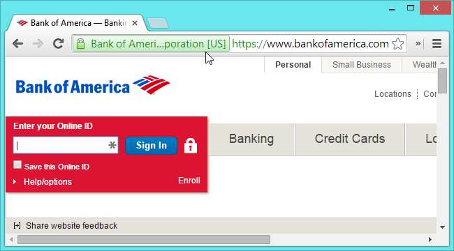 Satu hal yang dapat Anda percayai adalah browser web Anda. Jika ini menampilkan nama hijau di sebelah bilah alamat Anda, itu mengonfirmasi bahwa situs web saat ini telah memverifikasi identitasnya. Misalnya, pada gambar di bawah, browser web kami telah mengonfirmasi bahwa ini adalah situs Bank of America yang sebenarnya. Bank of America telah melalui proses verifikasi identitas. Baca lebih lanjut tentang sertifikat "Validasi Diperpanjang" ini dan bagaimana sertifikat tersebut lebih dapat dipercaya daripada sertifikat SSL biasa .