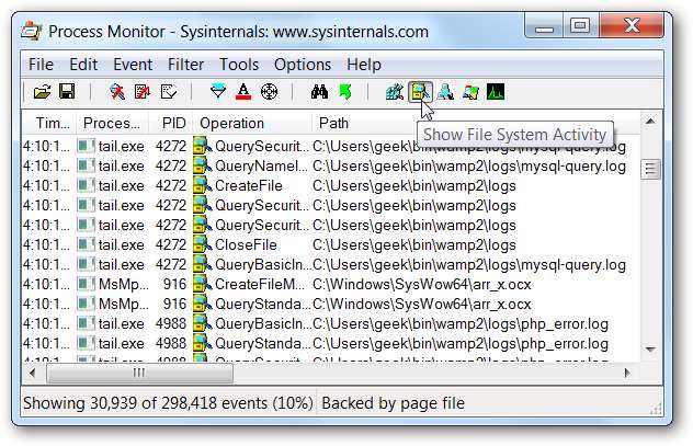 Buka saja Process Monitor, dan kemudian "hapus centang" semua ikon kecil di sisi kanan toolbar, biarkan hanya "Show File System Activity" yang dicentang. Pada tahap ini Anda akan melihat banyak dan banyak item dalam daftar, dengan setiap akses ke sistem file.