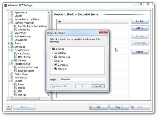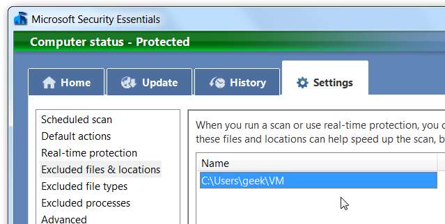 Microsoft Security Essentials membuatnya sangat mudah untuk mengecualikan file — cukup masuk ke Pengaturan, pilih File & lokasi yang dikecualikan di sisi kiri, lalu tambahkan folder ke dalam daftar di sisi kanan.