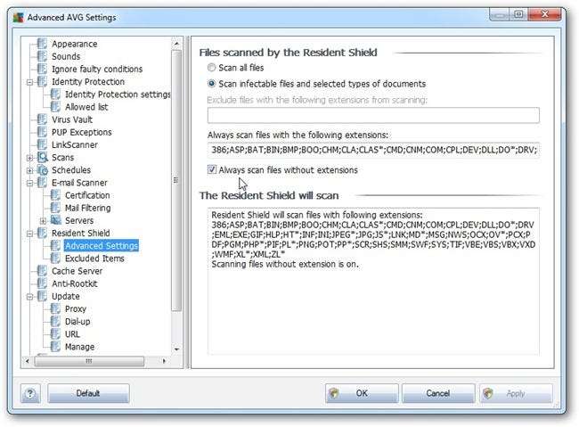 Kemudian menuju ke Resident Shield -> Pengaturan Lanjutan untuk melihat daftar jenis file yang sedang dipindai. Anda akan melihat bahwa AVG selalu memindai file tanpa ekstensi, yang biasanya tidak menimbulkan masalah, tetapi mungkin ada masalah tergantung pada aplikasi yang Anda gunakan.