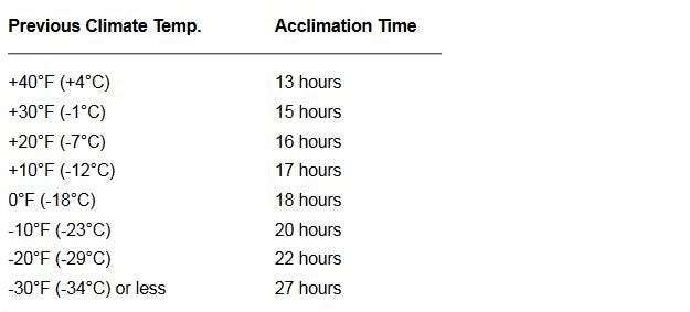- Jika Anda baru saja menerima atau melepaskan unit ini dari iklim dengan suhu di atau di bawah 50 ° F (10 ° C), jangan buka wadah ini sampai kondisi berikut terpenuhi, jika tidak kondensasi dapat terjadi dan merusak perangkat dan / atau media dapat terjadi. Tempatkan paket ini di lingkungan operasi selama durasi waktu menurut bagan suhu berikut.