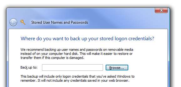 Benar, Anda harus menekan Ctrl + Alt + Delete untuk benar-benar membuat cadangan kredensial, dan Anda akan dimintai kata sandi untuk mengamankan file. Pastikan itu sesuatu yang mudah diingat atau Anda tidak akan dapat memulihkan kredensial nanti.
