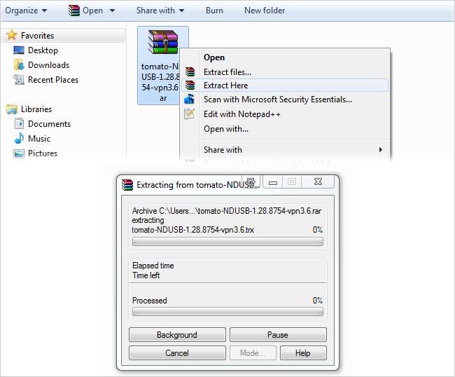 Anda memerlukan program untuk mengekstrak file .rar. Kami menyarankan menggunakan WinRAR karena gratis untuk dicoba dan mudah digunakan. Anda dapat mengunduh sendiri salinan versi gratisnya di mereka website . Setelah menginstal WinRAR, klik kanan pada file yang Anda unduh dan klik Extract Here. Anda kemudian akan melihat dua file bernama CHANGELOG dan tomato-NDUSB-1.28.8754-vpn3.6.trx.
