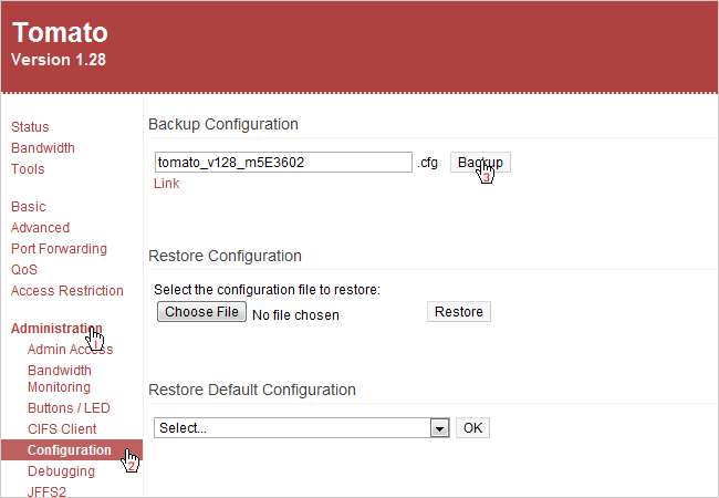 Meskipun tidak diperlukan, Anda mungkin ingin mencadangkan konfigurasi Tomat Anda saat ini sebelum meningkatkan ke VPN TomatoUSB, untuk berjaga-jaga. Untuk menyimpan konfigurasi Anda, navigasikan ke Administrasi> Konfigurasi dan klik tombol Cadangan. Ini akan meminta Anda untuk menyimpan file .cfg ke komputer Anda.