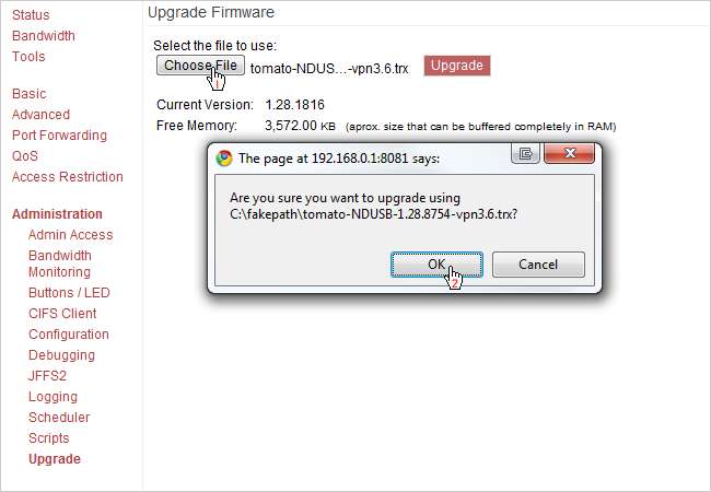 Sekarang saatnya mengupgrade Tomato ke TomatoUSB VPN. Klik Tingkatkan di kolom kiri dan klik tombol Pilih File. Arahkan ke file yang kami ekstrak sebelumnya dan pilih tomato-NDUSB-1.28.8754-vpn3.6.trx mengajukan. Kemudian klik tombol upgrade.