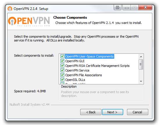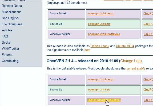 Sekarang mari menuju ke OpenVPN Download halaman dan unduh Penginstal Windows OpenVPN. Dalam panduan ini, kami akan menggunakan versi terbaru kedua dari OpenVPN yang disebut 2.1.4. Versi terbaru (2.2.0) memiliki file bug di dalamnya yang akan membuat proses ini menjadi lebih rumit. File yang kami unduh akan menginstal program OpenVPN yang memungkinkan Anda untuk terhubung ke jaringan VPN Anda, jadi pastikan untuk menginstal program ini di komputer lain mana pun yang Anda inginkan untuk bertindak sebagai klien (karena kita akan melihat bagaimana melakukannya kemudian). Simpan file .exe openvpn-2.1.4-install ke komputer Anda.