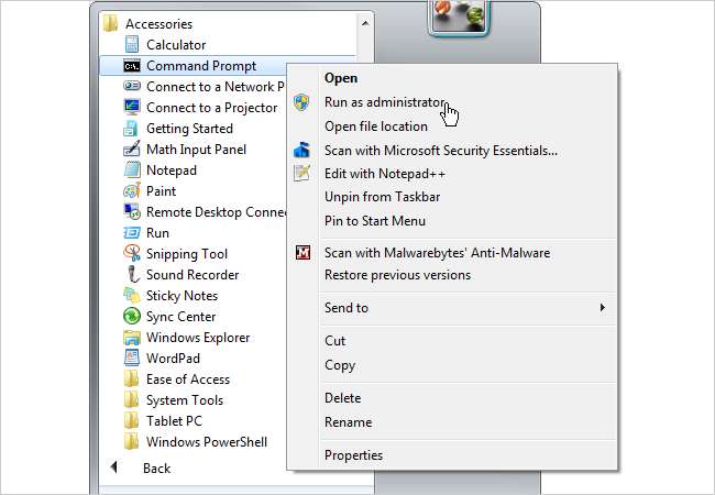 Klik tombol Start Windows dan navigasikan di bawah Accessories. Anda akan melihat program Command Prompt. Klik kanan padanya dan klik Jalankan sebagai administrator.