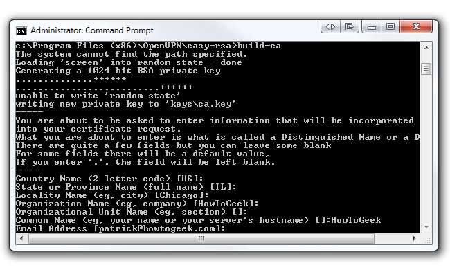 Setelah menjalankan build-ca perintah, Anda akan diminta untuk memasukkan Nama Negara, Negara Bagian, Lokalitas, dll. Karena kami sudah menyiapkan parameter ini di Tahun file, kita dapat melewati opsi ini dengan menekan Enter, tapi! Sebelum Anda mulai menekan tombol Enter, perhatikan parameter Nama Umum. Anda dapat memasukkan apa saja di parameter ini (yaitu nama Anda). Pastikan Anda masuk sesuatu . Perintah ini akan mengeluarkan dua file (sertifikat CA Root dan kunci CA Root) di folder easy-rsa / keys.