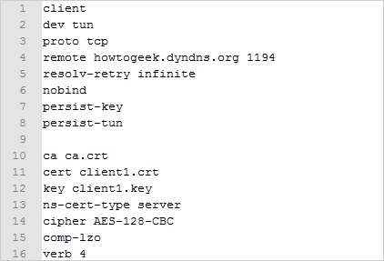 Namun, kami menginginkan milik kami client.ovpn file agar terlihat mirip dengan ini gambar di bawah ini. Pastikan untuk mengubah nama host DynDNS menjadi nama host Anda di baris 4 (atau ubah ke alamat IP publik Anda jika Anda memiliki yang statis). Biarkan nomor port menjadi 1194 karena ini adalah port OpenVPN standar. Selain itu, pastikan untuk mengubah baris 11 dan 12 untuk mencerminkan nama file sertifikat dan file kunci klien Anda. Simpan ini sebagai file .ovpn file baru di folder OpenVPN / config.
