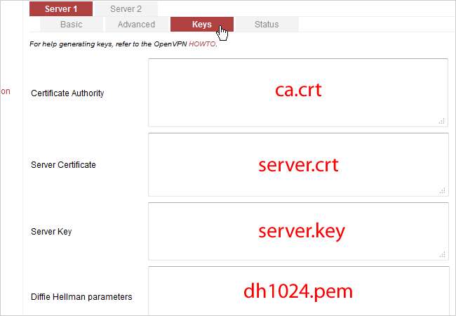 Langkah terakhir kami adalah menempelkan kunci dan sertifikat yang kami buat sebelumnya. Buka tab Keys di sebelah Advanced. Di Windows Explorer, navigasikan ke C: \ Program Files (x86) \ OpenVPN \ easy-rsa \ keys pada 64-bit Windows 7 (atau C: \ Program Files \ OpenVPN \ easy-rsa \ keys pada 32-bit Windows 7). Buka setiap file yang sesuai di bawah ( ca.crt , server.crt , server.key , dan dh1024.pem ) dengan Notepad atau Notepad ++ dan salin isinya. Tempel konten di kotak yang sesuai seperti yang terlihat di bawah ini. Perlu diperhatikan bahwa Anda hanya perlu menempel semua di bawah —–MULAI SERTIFIKAT—– di server.crt . OpenVPN akan tetap berfungsi dengan baik jika Anda menempelkan seluruh file, tetapi itu lebih "bersih" hanya dengan menempelkan info sertifikat yang sebenarnya. Klik Simpan, lalu klik Mulai Sekarang.