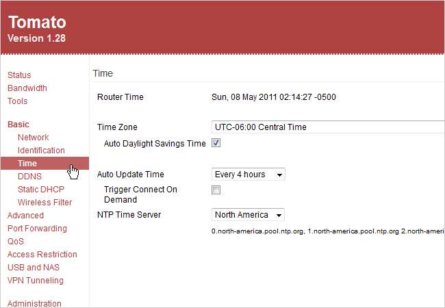 Sebelum kami menguji koneksi VPN kami, ada satu hal lagi yang harus kami periksa di dalam Tomat. Klik Dasar di kolom sebelah kiri dan kemudian Waktu. Pastikan Waktu Router sudah benar dan Zona Waktu menampilkan zona waktu Anda saat ini. Setel NTP Time Server ke negara Anda.