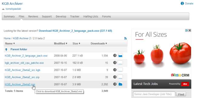 Untuk mengunduh perangkat lunak, buka bagian File pada halaman, lihat di folder KGB Archiver 2 dan kemudian unduh file penginstal .msi dari folder 2.0 beta 2. Setelah menjalankan instalasi, alat kompresi dapat diakses melalui menu konteks di Explorer - cukup klik kanan file, folder, atau pemilihan item dan pilih opsi 'Kompres ke xxx.kgb'.