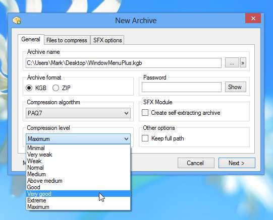Ada tidak kurang dari sepuluh tingkat kompresi yang tersedia mulai dari Minimal hingga Di Atas Sedang hingga Maksimum. Anda juga dapat melindungi arsip dengan kata sandi dan membuat arsip yang mengekstrak sendiri, tetapi kompresi itu sendiri yang sangat menarik.