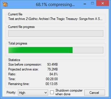 KGB Archiver bernasib lebih baik, menghasilkan arsip 81.6MB. Sekali lagi, ini membutuhkan waktu lebih dari tiga puluh menit, dan ini menggunakan mesin quad-core. Apakah tabungan seperti ini sepadan? Itu sepenuhnya terserah Anda untuk memutuskan.