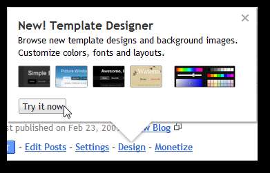 Saat Anda masuk ke Dasbor Blogger, Anda mungkin melihat munculan baru yang menunjukkan Perancang Template baru. Klik Coba sekarang tombol untuk memulai.