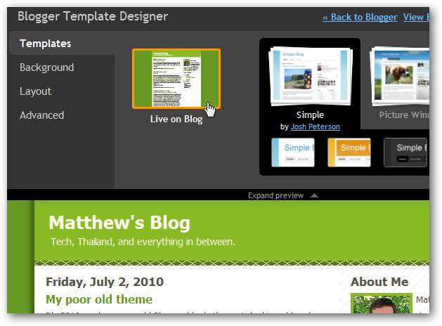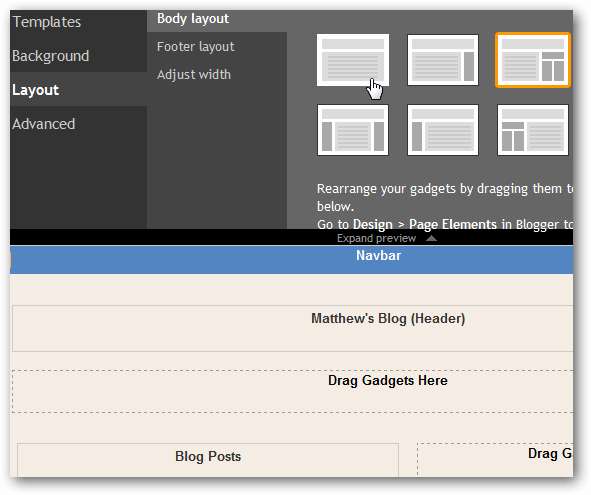 Sekarang, Anda dapat mengubah tata letak blog Anda untuk lebih menyesuaikannya. Klik Tata Letak tab di kiri atas, dan pilih tata letak baru. Perhatikan bahwa pratinjau blog Anda di bagian bawah halaman akan berubah ke tampilan desainer Blogger lama, dan Anda dapat menarik dan melepas elemen ke tempat yang Anda suka seperti sebelumnya.