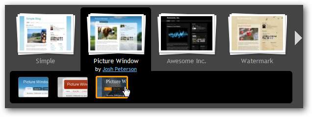 Pertama, dari tab Template, pilih kumpulan Tema baru, lalu pilih salah satu variasi yang tersedia di bawahnya. Jika Anda tidak melihat yang Anda suka, klik panah kanan untuk menampilkan lebih banyak tema. Saat ini ada 6 set tema, tetapi masing-masing menawarkan beberapa variasi.