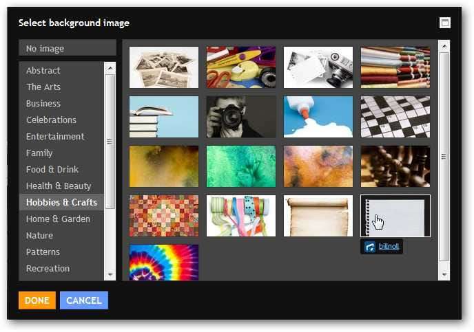 Klik tombol Gambar latar belakang untuk memilih dari berbagai macam latar belakang yang bagus dan gratis dari iStockPhoto. Pilih kategori di sebelah kiri, lalu klik gambar yang ingin Anda gunakan untuk menerapkannya ke blog Anda. Anda akan segera melihat perubahannya di pratinjau blog Anda; jika Anda suka, klik Selesai , atau kembali dan pilih yang lain jika Anda mau.
