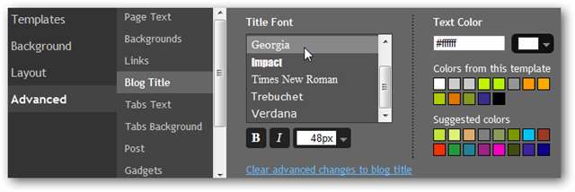 Terakhir, jika Anda ingin menyesuaikan font dan warna pada template Blog Anda, pilih Maju tab dan kemudian pilih bagian dari blog Anda yang ingin Anda sesuaikan.