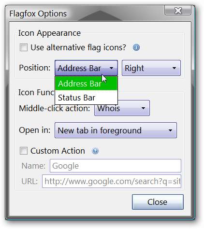 Pilih untuk menampilkan Flagfox di Bilah Alamat atau Bilah Status…