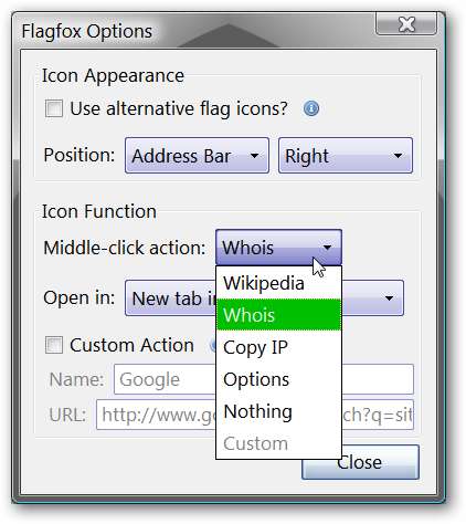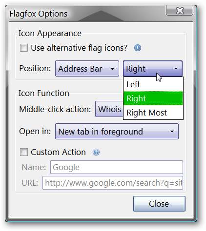 Opsi untuk Flagfox bagus dan mudah digunakan. Terutama mereka fokus pada lokasi ikon, tampilan ikon, dan layanan yang digunakan dengan ekstensi.