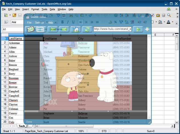 Memperkenalkan Visi Ganda , aplikasi yang memungkinkan Anda menonton Hulu, YouTube, atau menjelajahi Internet sambil terlihat sibuk bekerja keras. Double Vision dibangun dari Internet Explorer dan diubah menjadi browser media online yang dapat menjadi transparan untuk bekerja dari dalam aplikasi "pekerjaan nyata".