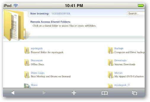 Setelah Anda menyiapkan Akses Jarak Jauh di Windows Home Server, Anda akan dapat mengakses file dan folder bersama dari mana saja secara virtual. Untuk artikel ini kami mengakses WHS dari iPod Touch yang menjalankan iOS 4.0, tetapi Anda dapat mengaksesnya dari ponsel pintar, tablet, perangkat Android, komputer… pada dasarnya perangkat apa pun dengan akses Internet. Server yang kami gunakan adalah mesin yang dibuat di rumah, dan kami akan berusaha mendapatkan akses dasar ke dokumen Anda melalui browser Safari.