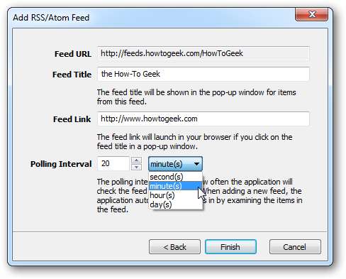 Pilih interval polling Anda. Ini adalah seberapa sering feed Anda akan diperiksa untuk item baru. Anda dapat mengatur interval polling Anda untuk hari, jam, menit, atau bahkan detik. Klik Selesai .