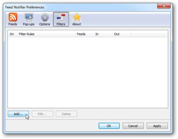 Unduh dan pasang Feed Notifier. (Download link di bawah) Setelah Anda selesai menginstal, jendela Feed Notifier Preferences akan terbuka. Klik pada Menambahkan… tombol untuk menambahkan umpan RSS.