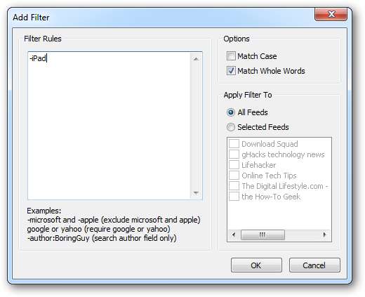 … lalu ketik aturan filter. Anda bahkan dapat memilih untuk menerapkannya hanya pada feed tertentu. Klik baik .