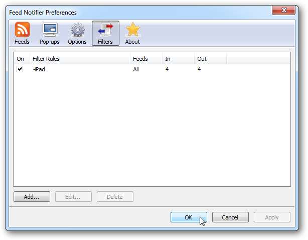 Feed Notifier akan ditampilkan pada tab filter berapa kali filter diterapkan. Klik baik saat selesai.