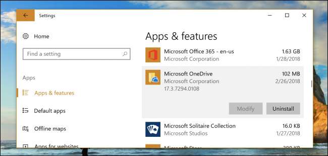 Daripada menonaktifkan sesuatu yang Anda rencanakan untuk tidak pernah digunakan, opsi nuklirnya adalah dengan menghapusnya. Masuk ke Pengaturan (tekan Windows + I), klik opsi "Aplikasi", temukan Microsoft OneDrive di bawah bagian "Aplikasi & Fitur", lalu klik tombol "Hapus".