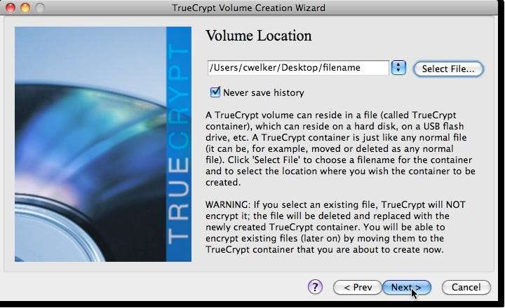 Di sinilah Anda akan memilih lokasi wadah. Jika Anda memilih file yang sudah ada, TrueCrypt akan menghapus dan menimpa file tersebut. Pilih nama file baru dan lokasi yang Anda inginkan untuk menempatkan penampung.