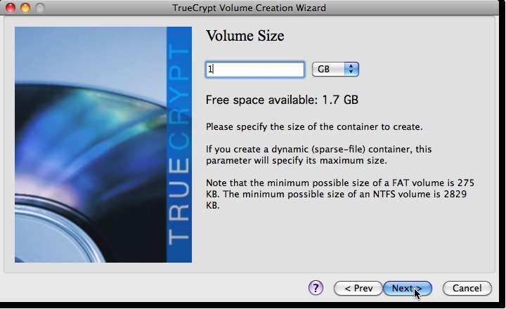 Di sinilah kita bisa memilih ukuran volume dari disk virtual yang kita buat. TrueCrypt akan memberi tahu Anda berapa banyak ruang yang Anda miliki. Drop down akan membiarkan Anda memilih apakah nomor Anda akan dalam KB, MB atau GB. Untuk saat ini, mulai dengan volume 1 GB.