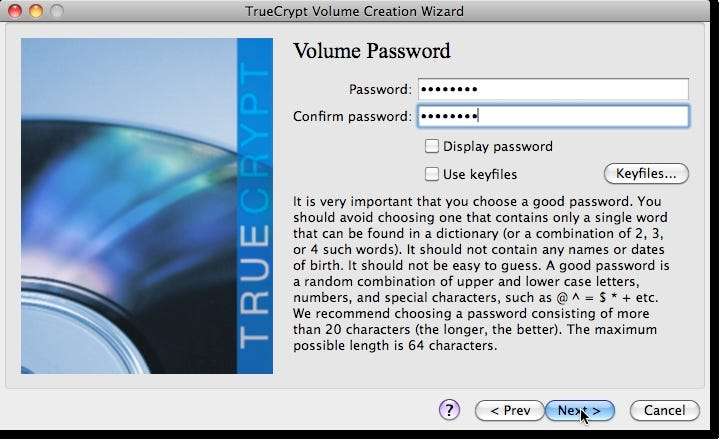 Sekarang saatnya memilih kata sandi. Meskipun TrueCrypt akan memperingatkan Anda untuk menggunakan 20+ karakter yang kuat (tidak menggunakan kata kamus, menggunakan 3 dari simbol, angka, tutup dan huruf kecil) kata sandi, jika Anda tidak dapat mengingat kata sandinya, itu berarti kehilangan data terenkripsi Anda. pilihlah sesuatu yang dapat Anda ingat, tetapi itu akan membuat data Anda tetap aman dari mata-mata.