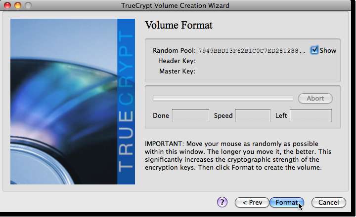 Di sini kami akan membantu TrueCrypt dalam memilih header dan kunci master untuk enkripsi volume Anda. Anda melihat bagaimana ketika Anda menggerakkan mouse Anda, kumpulan acak berubah? Setelah Anda merasa memiliki serangkaian angka yang bagus untuk memilih format klik formulir dan proses akan mulai mengenkripsi disk virtual Anda.